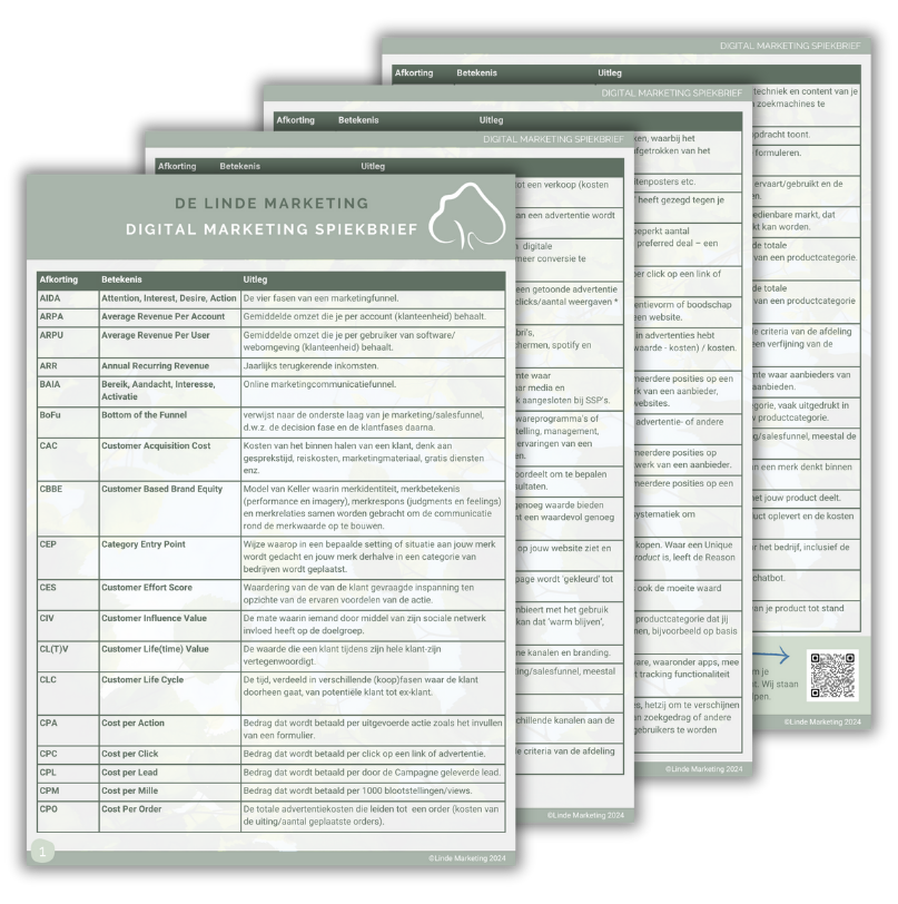 Dit jaar compacter en met nóg meer afkortingen. Je vindt er in waar de afkortingen voor staan en een korte beschrijving van de betekenis. Wel zo handig voor de marketeer. En net zo handig voor de niet-marketeer. Gratis en voor niets. We passen deze spiekbrief periodiek aan. Dus heb je suggesties, input, verbeteringen of aanvullingen?  Stuur ons dan vooral een berichtje, Dan zorgen we dat jouw afkorting in onze volgende editie is opgenomen.